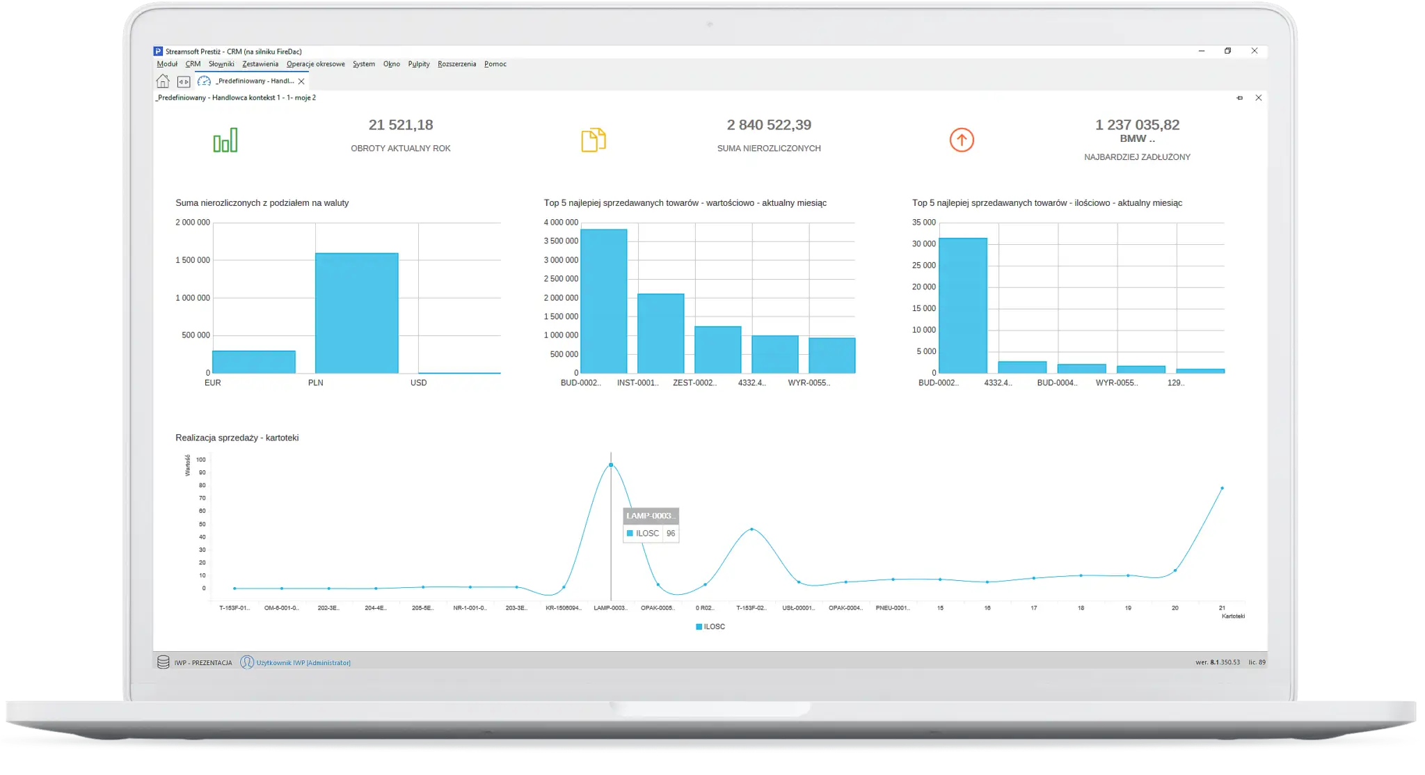 Moduł CRM Streamsoft Prestiż pozwala zaplanować sprzedaż i naliczyć jej wartość. Z dokumentów sprzedaży, jak i niezafakturowanych WZ. Zdecydowanie wspomaga to pracę działu handlowego. Przełożeni natomiast zyskują bieżący wgląd w wyniki sprzedażowe w kontekście jednego handlowca oraz całej grupy.